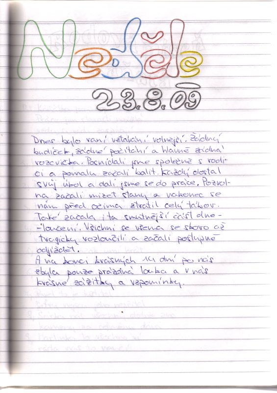 NEDĚLE 23.8.09 Dnes bylo raní vztávání volnější. Žádný budíček, žádné počítání a hlavně žádná rozcvička. Posnídali jsme společně s rodi- či a pomalu začali balit. Každý dostal svůj úkol a dali jsme se do práce. Pozvol- na začali mizet stany a nakonec se nám před očima ztratil celý tábor. Také začala i ta smutnější část dne - - loučení. Všichni se všema se skoro až tragicky rozloučili a začali postupně odjíždět. A na konci krásných 14 dní po nás zbyla pouze prázdná louka a v nás krásné zážitky a vzpomínky.