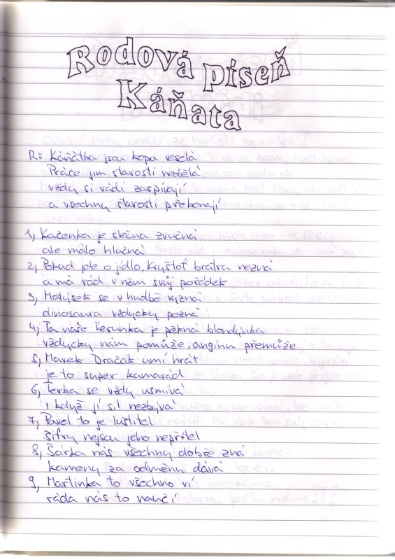RODOVÁ PÍSEŇ KÁŇATA R: Káňátka jsou kopa veselá Práce jim starosti nedělá vždy si rádi zaspívají a všechny starosti překonají 1) Kačenka je slečna zvučná ale málo hlučná 2) Pokud jde o jídlo, Kryštof bratra nezná a má rád v něm svůj pořádek 3) Matýsek se v hudbě vyzná dinosaura vždycky pozná 4) Ta naše Verunka je pěkná blondýnka vždycky nám pomůže, angínu přemůže 5) Marek Dračák umí hrát je to super kamarád 6) Terka se vždy usmívá i když jí sil nezbývá 7) Pavel to je luštitel šifry nejsou jeho nepřítel 8) Šárka nás všechny dobře zná kameny za odměnu dává 9) Martinka to všechno ví ráda nás to naučí